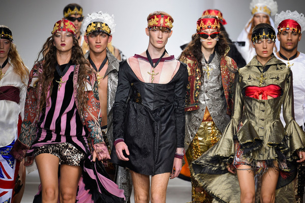 The dysfunctional family of decadents in his showcase was richly arrayed in gorgeous garb that deliberately played with notions of gender, muddling 16th-century images of masculinity with piratical glamour and 21st-century rock’n’roll gender-bending. New Central Saint Martin’s womenswear graduate Marler also strutted out himself, modelling a princess dress and huge ‘MUM’ earrings.